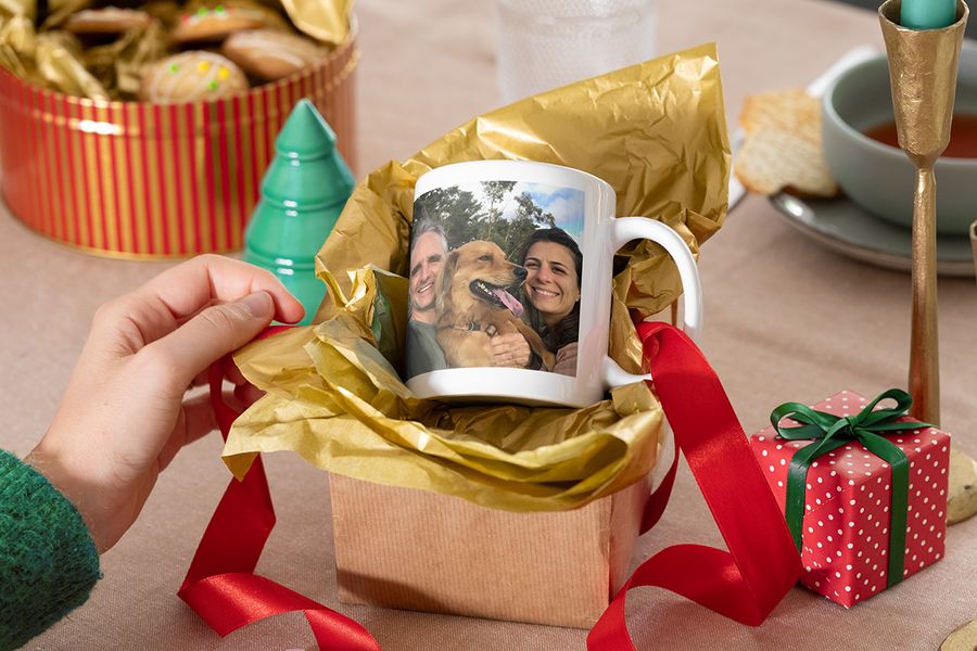 If you’re looking for small but meaningful Christmas photo gifts, personalised mugs are always a great choice. They’re perfect little gifts for your favourite people, from family members to coworkers. And the best thing: they’re super easy to create on the go. Simply add your photo and a funny or inspiring message and you’re done. If you want to make your present even more creative, you can also create your own Christmas wrapping.