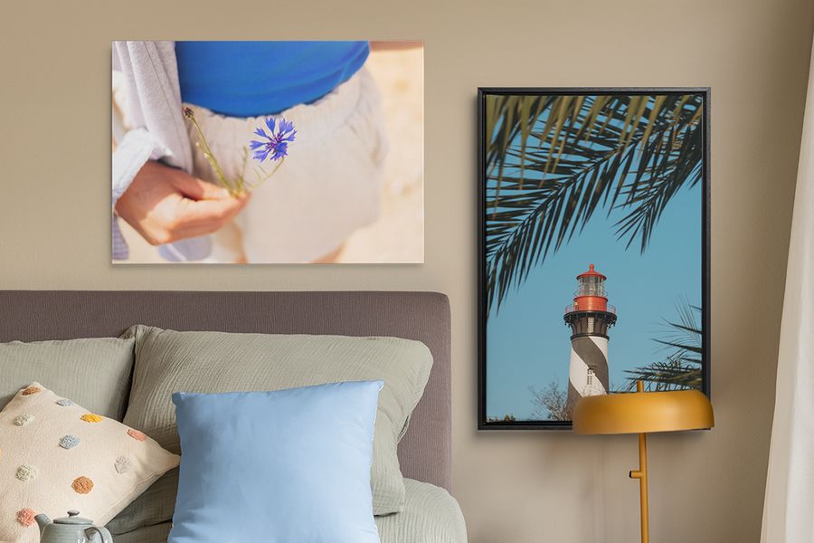Texture is your friend here. Mix posters with canvas, and throw in sleek acrylic or aluminium pieces to add depth. Whether you’ve got space for a three photo gallery wall or 12 photo gallery wall, switching up the variety of wall art pieces you use is sure to make for a show-stopping display.