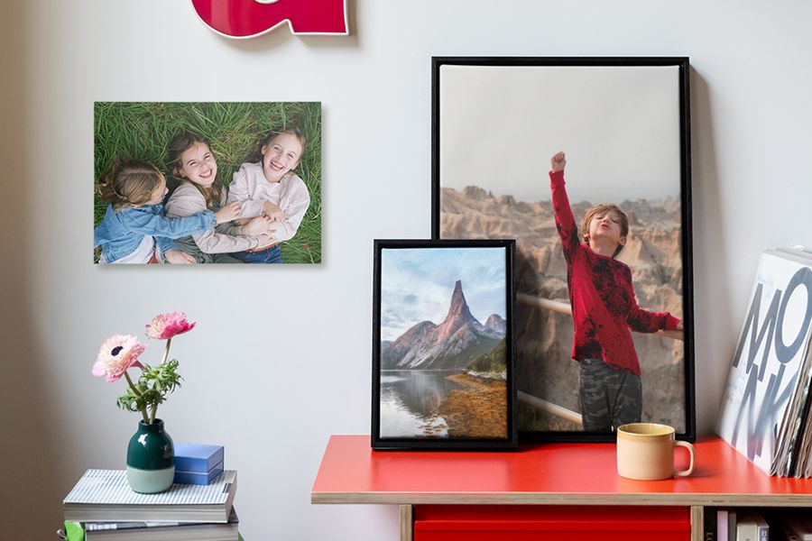 The most dynamic displays are gallery walls with a mix of photos and art. Turn your holiday landscapes into large acrylic prints, those candid camera roll shots of your nearest and dearest into framed posters, and pop some copyright-free artwork or quotes onto smaller lightweight mounted prints for a photo wall that’s truly you.