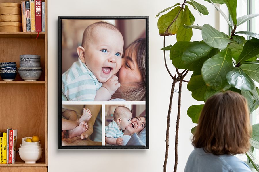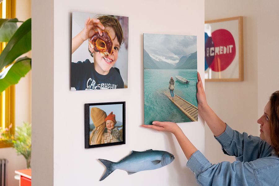 You can also just use what’s available in your camera roll for a photo montage wall, and stick to a colour palette or a theme. Family milestones, seaside adventures – a bit of a story can make your collage wall with photos feel cohesive and curated. Add photos of a similar vibrancy to a collage print. Or if you’re struggling to make things match, go monochrome – a black and white photo gallery wall looks immaculate on acrylic or aluminium prints. You can also add to it with new memories on multiple photo frames for the wall over time.