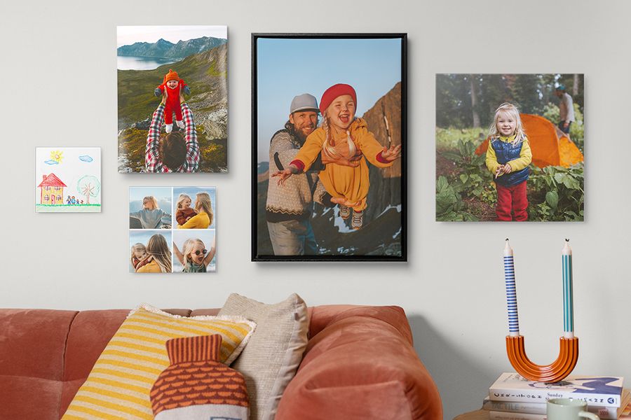If the kids share a room, a nice photo wall idea is to make mini gallery walls on either side. Simply creating different sizes and formats of photo prints lets them create their own little zone (and save you from any “this side is mine” debates). For a gallery wall with a mix of photos and art, upload photos of the kids drawings onto canvas prints to show off your little Picasso’s.